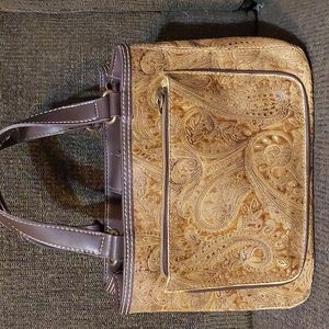 Relic tan leather purse, with dark brown trim and handles, open outside pocket on on side and zippered pocket on other side. Zippered pocket dividing inside into two sections. On the inside, one side has a zippered pocket and the other side has two open pockets - one is about the size of a smart phone and the other is about the size for glasses. A snap connector closes the top of purse. About 10" wide by 8" tall (not including handles) by almost 5" deep.