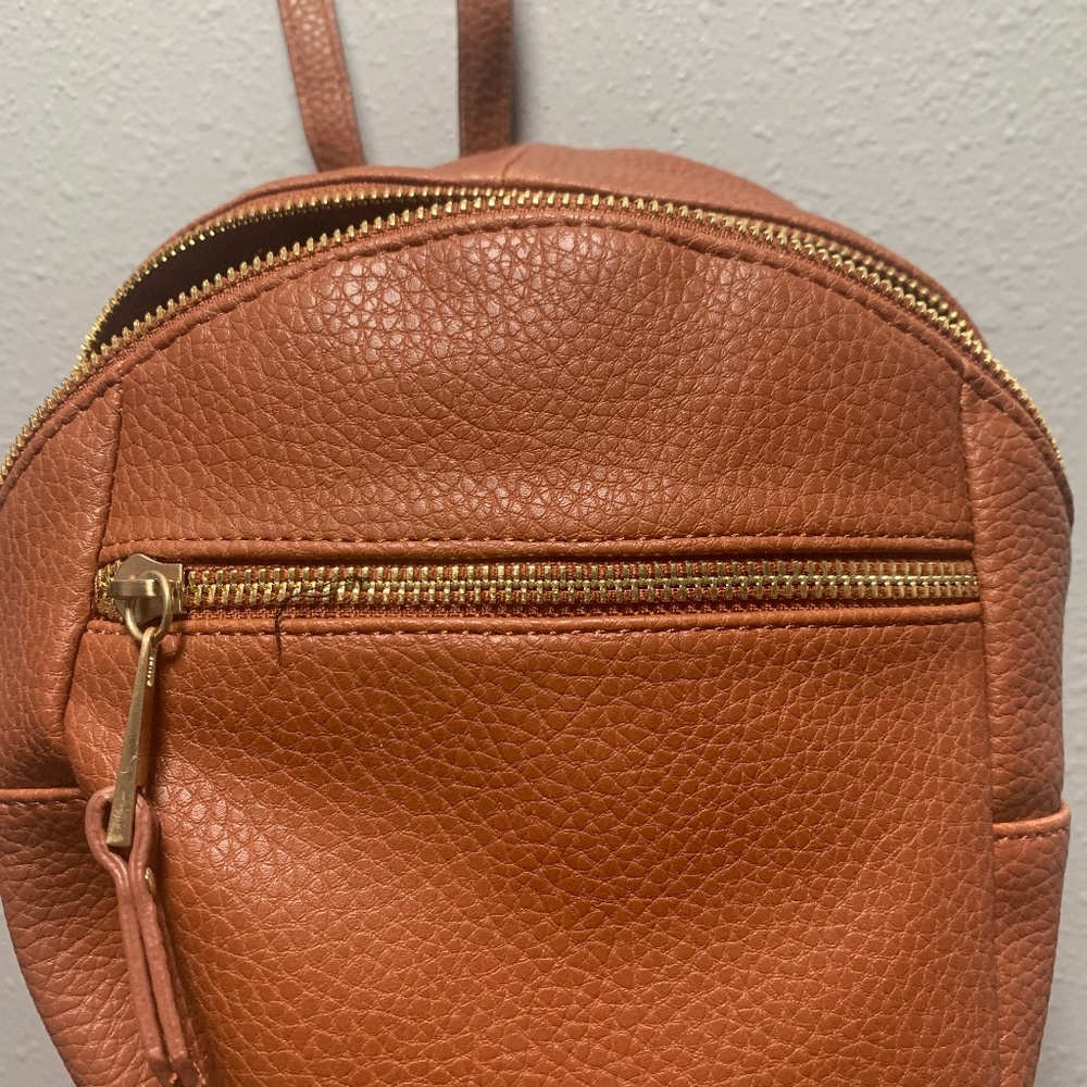 Purse has a very long strap can be changed to a backpack just pulled down the two sides of the jo strain a lot of space two zippers one small pocket gold finishing