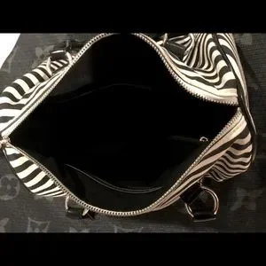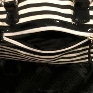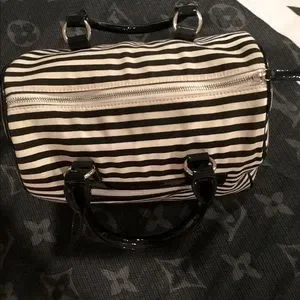 Modern black and ivory striped canvas bag with zipper closure, side pocket and patten leather handles and base. Super cute! Great condition!!