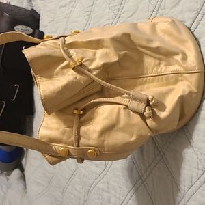 Round purse with long strap to go over body,goldish tan in color,there is a draw string to close