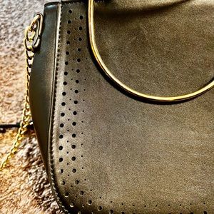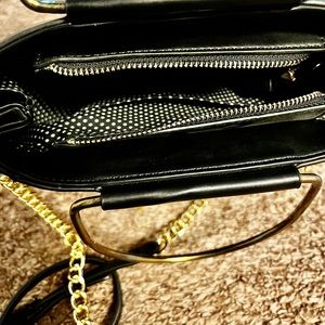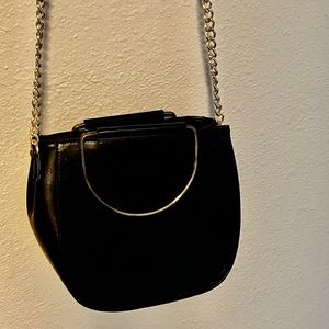Luxury Diva black pleather purse, with adjustable shoulder strap, and gold colored handles. With its flexible styling, it can be compatible with many outfits. It also has two pockets on the inside.