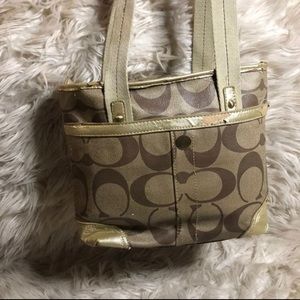 Brown, beige, and gold handbag. Pre owned. Has a few wears.