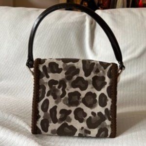 Not Sisters Two fancy, hand crafted handbag. Brown animal print, vleather drop handle, silver lioness decretive work on the front. Has four metallic feet on the bottom. stands up on its own.