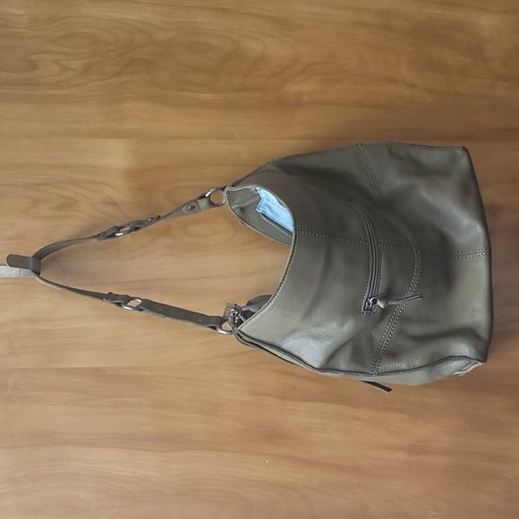 The Sak olive green leather 2 zipper pockets 1 in 1 outside fringe tassel. never used