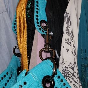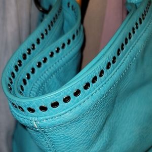 no brand. Teal, large shoulder bag. no tears or stains. gunmetal grommets and clips