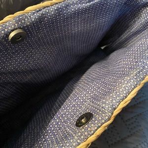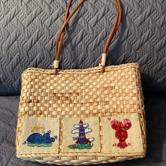 Straw bag, corn husk lining, leather handle, sequins and beads.
