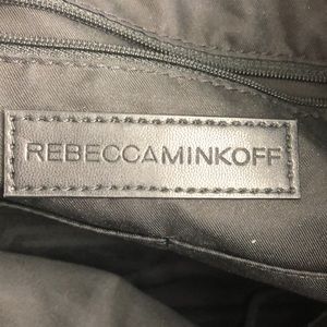 Black tote bag with one center pocket that zips along with a couple side pockets.