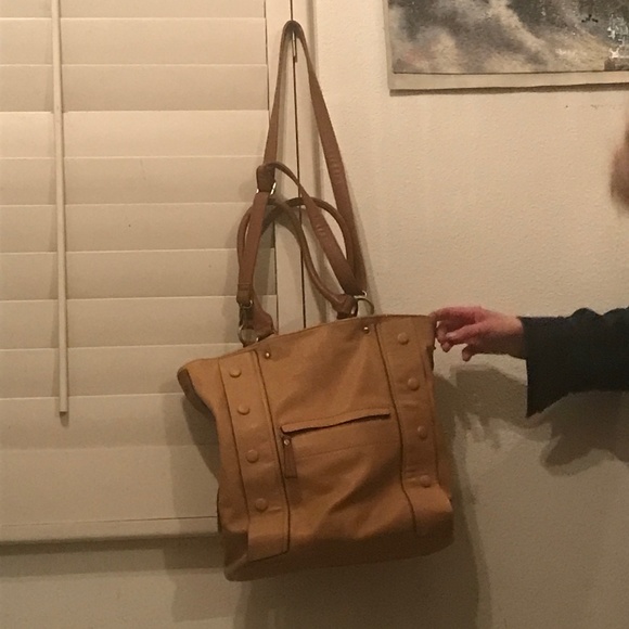 Large bag middle zipper with zipper side pocket and two slit pockets inside and zipper pockets on from and back with shoulder strap or body strap can detach faux leather with bottom detail front