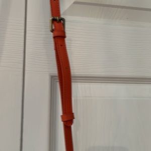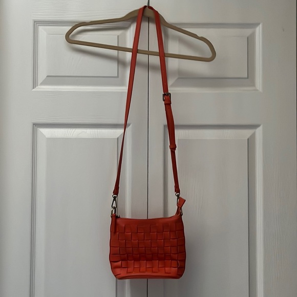 Joy Susan orange basket weave cross body purse. 7” x 9”. Removable adjustable strap. Burnished brass fasteners. Lightly worn. Manmade leather look. Polyester orange lining. Two inside pockets - one zipper closure.