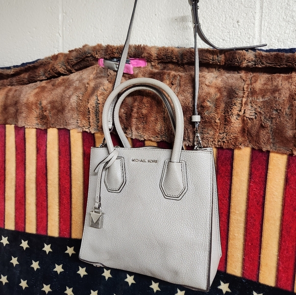 This is a cute little crossbody bag. Great for date night, bingo or casino bag. 3 compartments with middle zip closure, 3 credit card slots, removable crossbody strap then converts to clutch style. In gray wirh silvertone hardware. 7 1/2" tall 8 1/2" long with a long adjustable crossbody strap. 100% Leather.