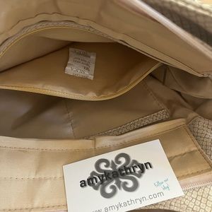 Amy Kathryn original hobo style bag. Made of canvas and leather. 5 bronze colored feet on the bottom. Zipper closure. 3 pockets in the main compartment. Please note the close up of the leather. The bag is new with tags. Has been in the closet and I have not tried cleaning the leather handles and knot area. Measures 11” x 9”