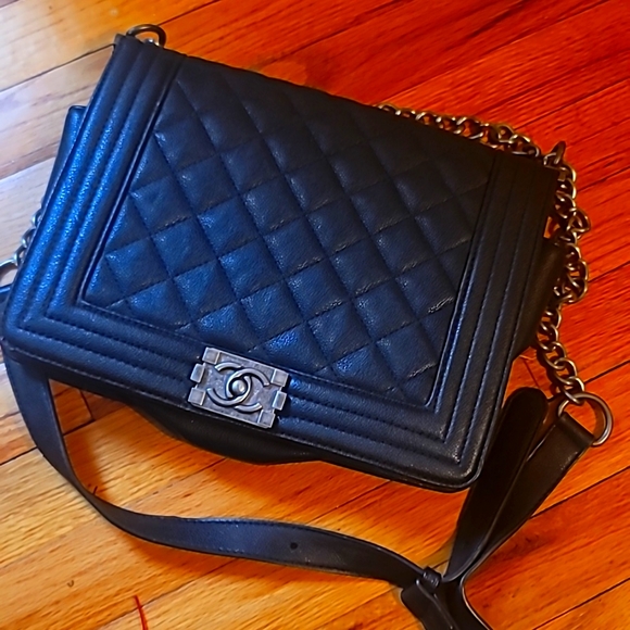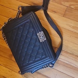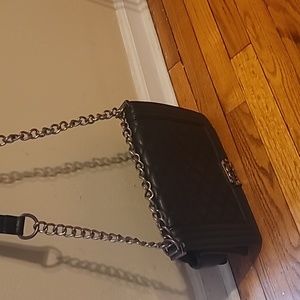 Black leather purse with silver chain links with strap