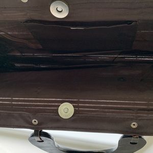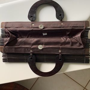 Made of wood n has an acetate lining! Made in Indonesia. Handles are also made of wood and are attached with leather cords. Has a button closure and measures 14” wide and 7” long.