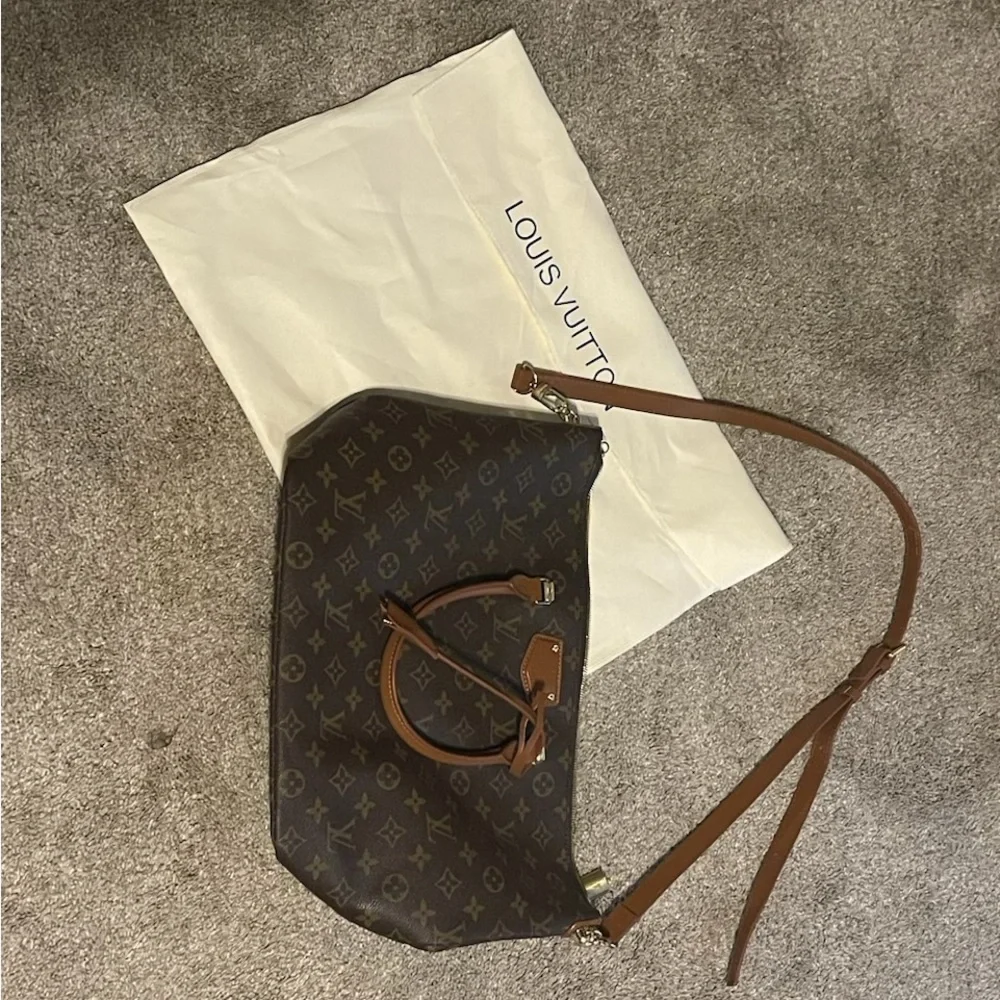 Leather, brown and light tan, like new purse, bought and used once was not the right size I needed. Kept in dust bag. Great quality
