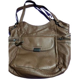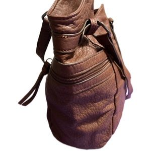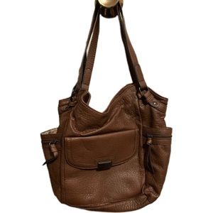 Gently used purse. Very clean. Has a snap closure on the top with a zippered compartment and pockets on the inside. On the front is a pocket with a snap closure. On the back is a zippered pocket and on both sides are pocket compartments with zippered compartments over them. Measurements are 14”x 10” x 5”. The two straps measure 20”.