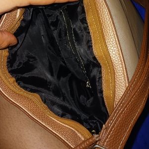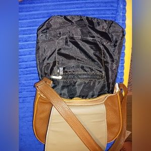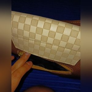 medium size purse with Checkers design on the flap three colors brown dark tan and a cream color with two small pockets with zippers over the shoulder or cross bag however you decide to style it