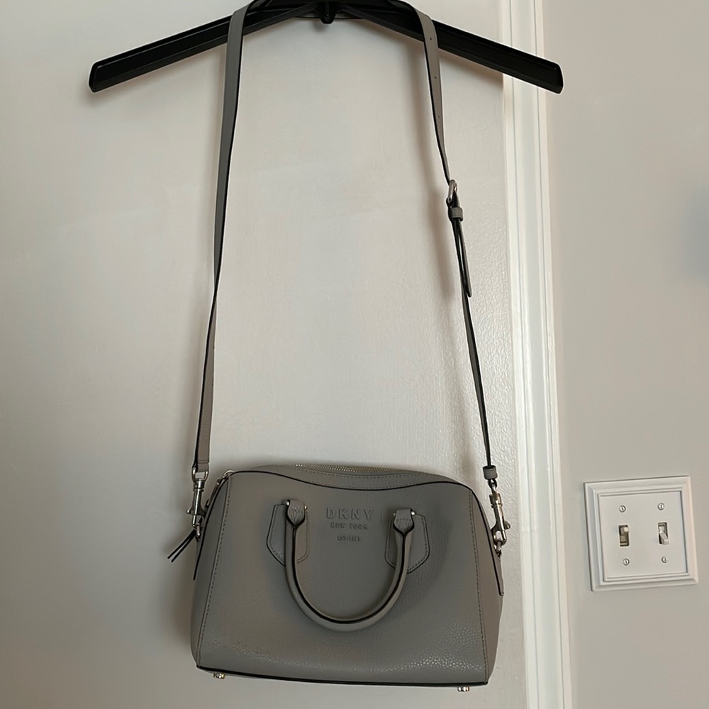 Medium size gray satchel style handbag. Condition like brand new. Rarely used. one zipper compartment inside. Has long strap as well. Measurements are approximately 10” length 8“ high and 5” wide