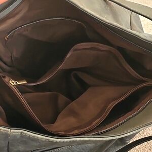 Large purse with multiple zipper compartments inside and out. Leopard details. Has a detachable shoulder strap as well, not pictured.