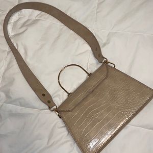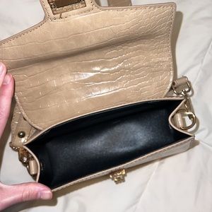 Small, tan leather purse with thick shoulder strap and gold hardware