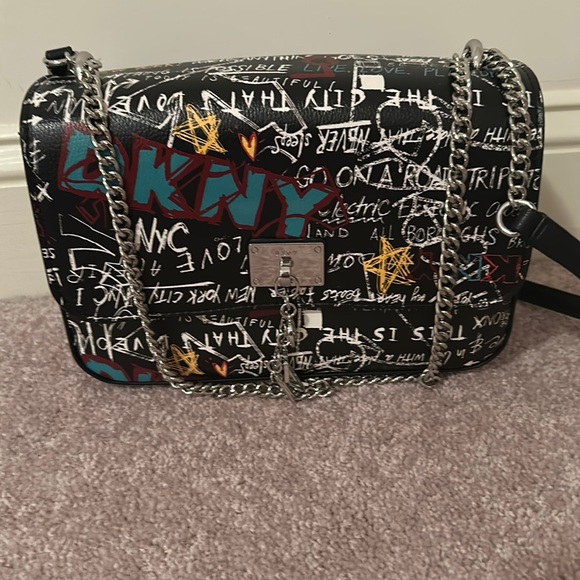 Dkny graffiti print bag. New never used. Outside back pocket inside zipper pocket middle zip pocket and one inside pocket snap close. Chain and leather strap . Size w 9.5” l 6.6” d 3”