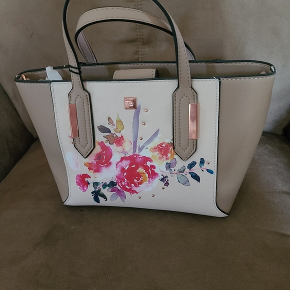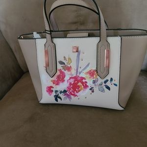 Medium sized purse with beige handles and trim. Foral motif on front. By Kate Laundry. original price before sale 194 dollars.