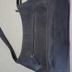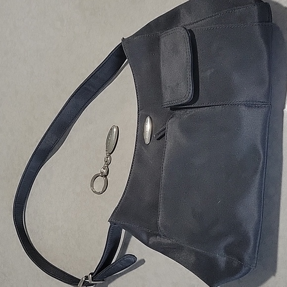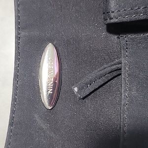 Nine West purse. 13 inches wide, 7 inches tall. Comes with a keychain in zipper pocket. There are places to put credit cards inside and a couple of pens. Zipper pocket inside as well.