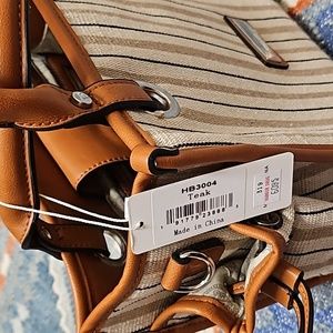 nwto tan, cream and black stripes. subtle sparkle. leather handles and trim