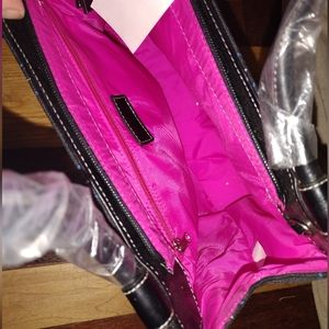 new purse. there's a few bucks on the bottom from daughter playing with it. still has plastic on and tag. really pretty pink inside.