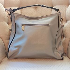 Never Used. Silver Purse with Fringe. Black Patent handle, pipping, & zipper handle. Also, has silver cross body strap with black piping. 2 pockets on the front, one on the back. Inside is divided into 2 sides with large centralized zipper pocket. & smaller side zipper pocket. Inside also had 2 open pockets. Top close is zipper. Loved the size & style...just not cool enough to pull it off; but you are!