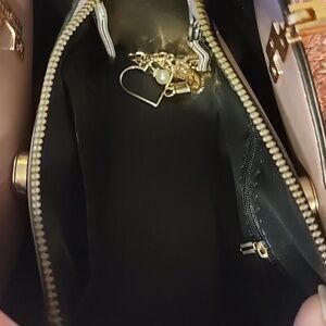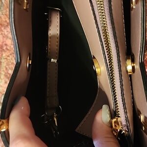 Faux leather in a dusty rose/heathered lavender. Brand new without tags has gold colored accents, two straps one gold one the color of the purse. This is the perfect size to carry your wallet and a few other things.