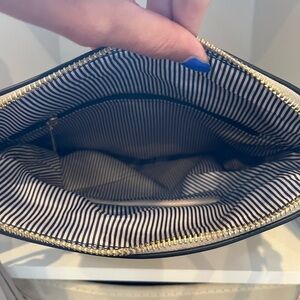 Medium-sized crossbody purse with multiple pockets, gold accents.