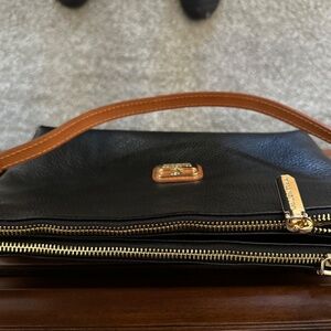 Valentina black leather purse with brown straps (crossbody or shoulder). Two zippered sections and one in the middle that snaps. This bag was only used twice, so it’s like new!