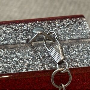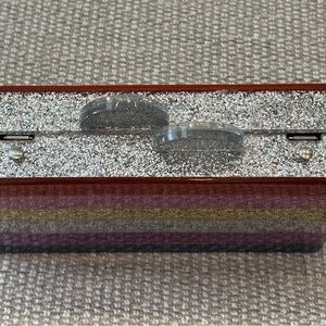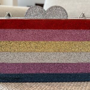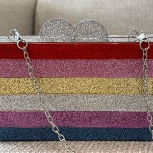 Purse. GOOD condition. Sturdy plastic purse with attractive design. See pictures for marks on the front and back of the purse. No odor. Magnetic closure. The closure is secure and works perfectly. The shoulder strap can be removed OR tucked into the purse. The inside of the purse does not have any compartments. I bought this purse at Nordstroms in the Childrens Department. An adult can use this purse as well. Measurements of the purse: 7 x 4.25 x 1.75 inches. Shoulder drop is 23 inches.