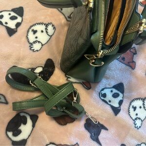 This elegant handbag features a beautiful floral embossed design in an olive green color. Only used a few times. In great condition. Has a strap to make it crossbody