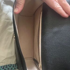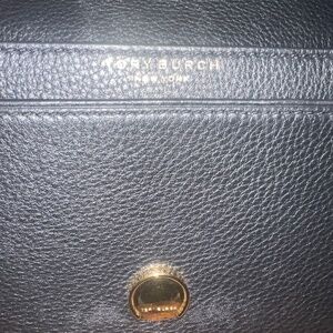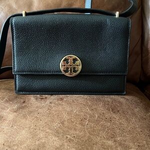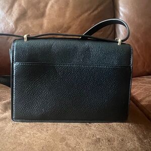 Black pebbled leather crossbody/ shoulder bag, exterior slip pocket, gold metal hardware with snap closure. Adjustable black leather crossbody strap with a 22” drop. With dust bag