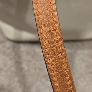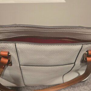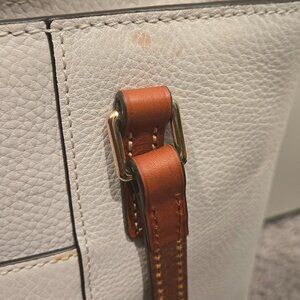 Dooney and Bourke small Lexington white purse brown/ Tan straps red interior 4 small discoloration brown. Otherwise rarely used.