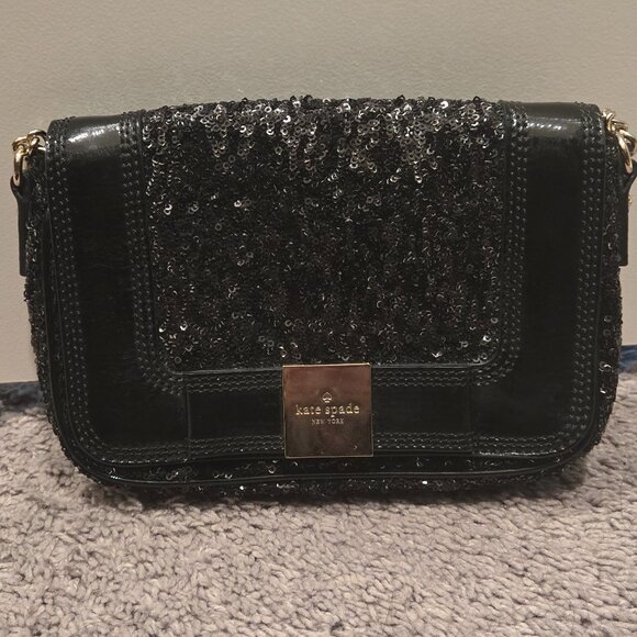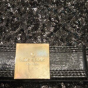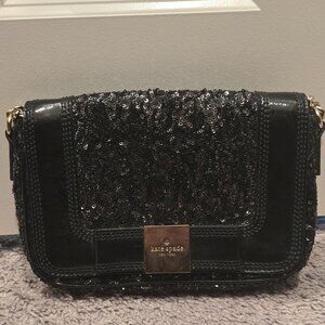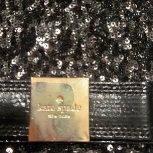 Black and silver Kate's Spade sequence purse poka dots inside with bow on buckle. Golden buckle has a small scratch. Golden chains to shinny black straps. Like new used 2.