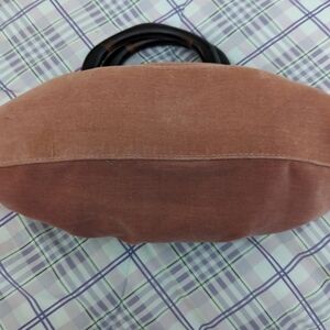 Beautiful purse that feels like crushed velvet. Mauve colored with purple stitching. Wood handles, so retro.