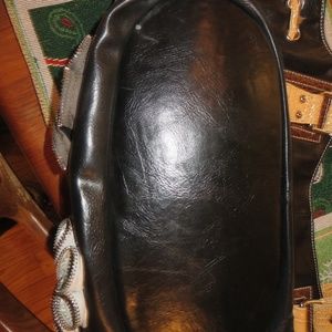 Fun bag with zipper flowers on the front. Slight wear, as there is a small dot on bottom where material is missing, and inside bottom area of material. Zippers work. Three pockets on the inside. Thank you for looking!