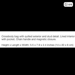 Zara Quilted Studded Crossbody bag with quilted exterior and stud detail. Lined interior with pocket. Chain handle and magnetic closure. , Height x Length x Width: 5.5 x 7.9 x 2.4.
