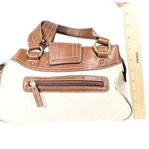 1. Chaps white canvas jacquard & brown faux leather flap satchel w/gold-tone hardware. Good condition w/light signs of wear including some marks on exterior. 1 zip pocket on back. Lined interior has 3 sections. Outer 2 sections have magnetic snap closures. Middle section has zip closure, 1 zip pocket & 2 slip pockets. 9.5" strap drop