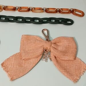 Enhance your style with this elegant purse charm set. Featuring a chic tan bow and a sophisticated blue bow, each adorned with delicate embellishments. Includes versatile dark green and tan chains for a customizable look.