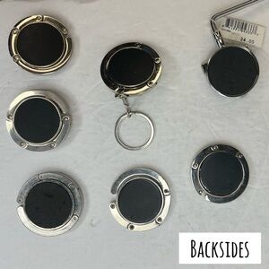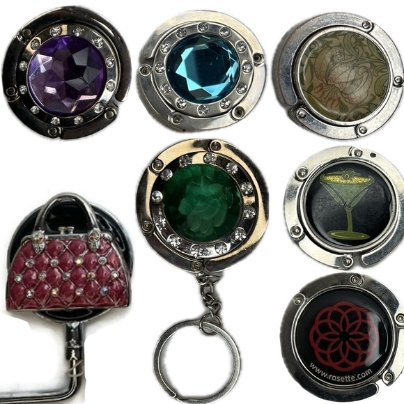 This is for a lot of 7 portable purse hooks. One has tags on it from Nordstrom. The other 6 are pre-owned and have surface scratches and wear possible. Please see the images, as they are part of the description and EXACTLY what will be received.