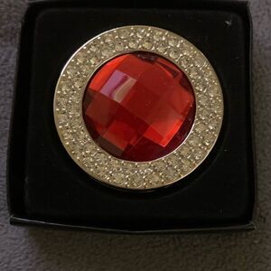Fabulous new in box folding purse hanger, never put your bag on floor or over a chair, do it with this glam hanger, chrome with huge beautiful red faceted jewel in the center. Shipped in a gift box.