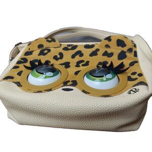 INTERACTIVE PET AND GIRLS PURSE: With leopard print fabric, pebbled faux leather, pop art eyes, an adjustable strap and metal hardware.