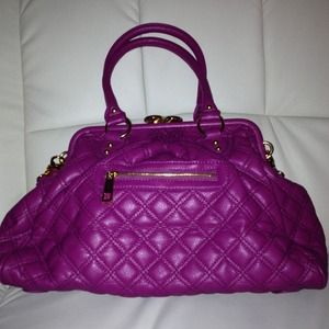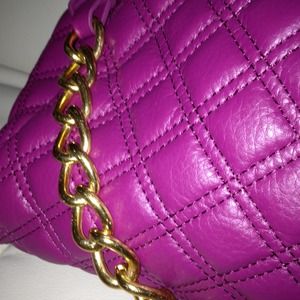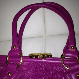 The raspberry color is a trendy touch to this classic style. This purse is for the brave fashionista that doesn't mind turning heads. It's a mid-sized purse with a clasp closure and gold accents. Inside is a divider pocket with zipper, side pocket with zipper and two drop slots. The removable chain strap keeps it versatile and adds an edgy twist. (No tags but is brand new and never been used)
