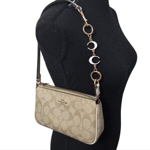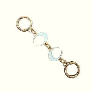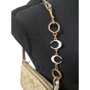 Add a touch of elegance to your favorite purse with this 5 inch purse strap extender. Featuring two white enamel crescent moons, this heavy duty extender is crafted with gold-tone hardware for a luxurious finish. Both ends are secured with large O-shaped clasps, blending functionality with a stylish design. Perfect for enhancing your bag’s charm while adding extra length for comfort.