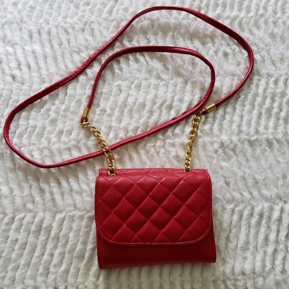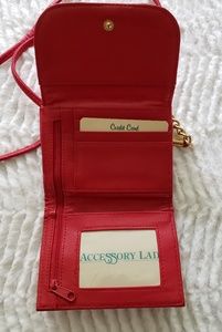 Red purse wallet, with 48" strap has partial gold chain. One side has zipper section with I.D. slots. One side snap closure.