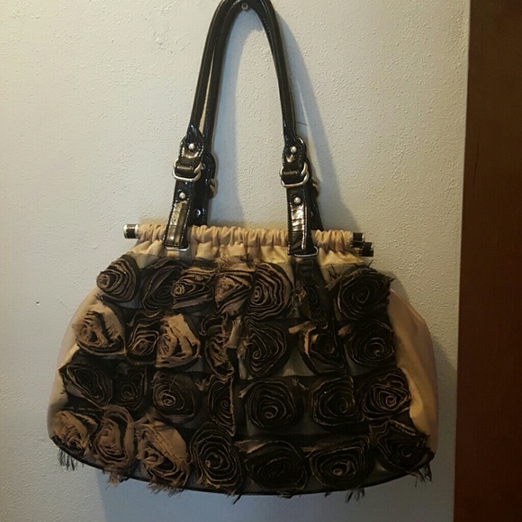 Perfect condition as the day I bought it. No scratches, no tears, no discoloration, no pen marks, no stains, anywhere on the purse. The inside is in perfect condition. The straps have no wear marks. No wear and tear of any sort on this purse. Only used a few times. The material covering the purse has a slight irradecent tint so it can catch different colors in different lighting. Unfortunately I cannot remember the brand, but this was purchased at The Buckle. Happy to send more pictures.