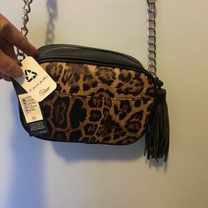 New tahini black leather & leopard print shoulder purse with black tassel